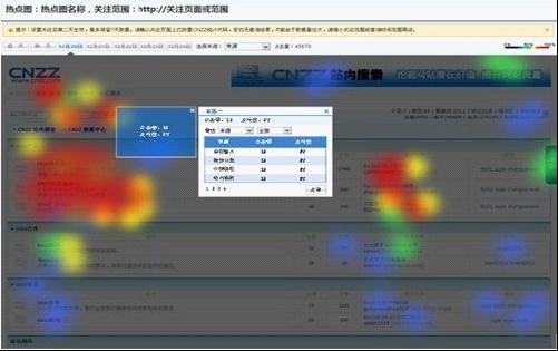 CNZZ統(tǒng)計(jì)工具在設(shè)計(jì)及研發(fā)上更加注重用戶體驗(yàn)與實(shí)用性,用戶只需將關(guān)注的受訪頁(yè)面鏈接添加到“熱點(diǎn)圖”功能中,并保證該頁(yè)面已成功放置CNZZ“站長(zhǎng)統(tǒng)計(jì)”代碼,第二天即可查看“熱點(diǎn)圖”相關(guān)數(shù)據(jù)情況。在申請(qǐng)開通“熱點(diǎn)圖”功能后,用戶可同時(shí)關(guān)注十個(gè)熱點(diǎn)頁(yè)面。打開某一頁(yè)面熱點(diǎn)圖,興趣點(diǎn)展現(xiàn)一目了然,圖中紅色區(qū)域表示點(diǎn)擊熱度最高,橙色、黃色、綠色次之,而藍(lán)色區(qū)域則表示點(diǎn)擊熱度最低。